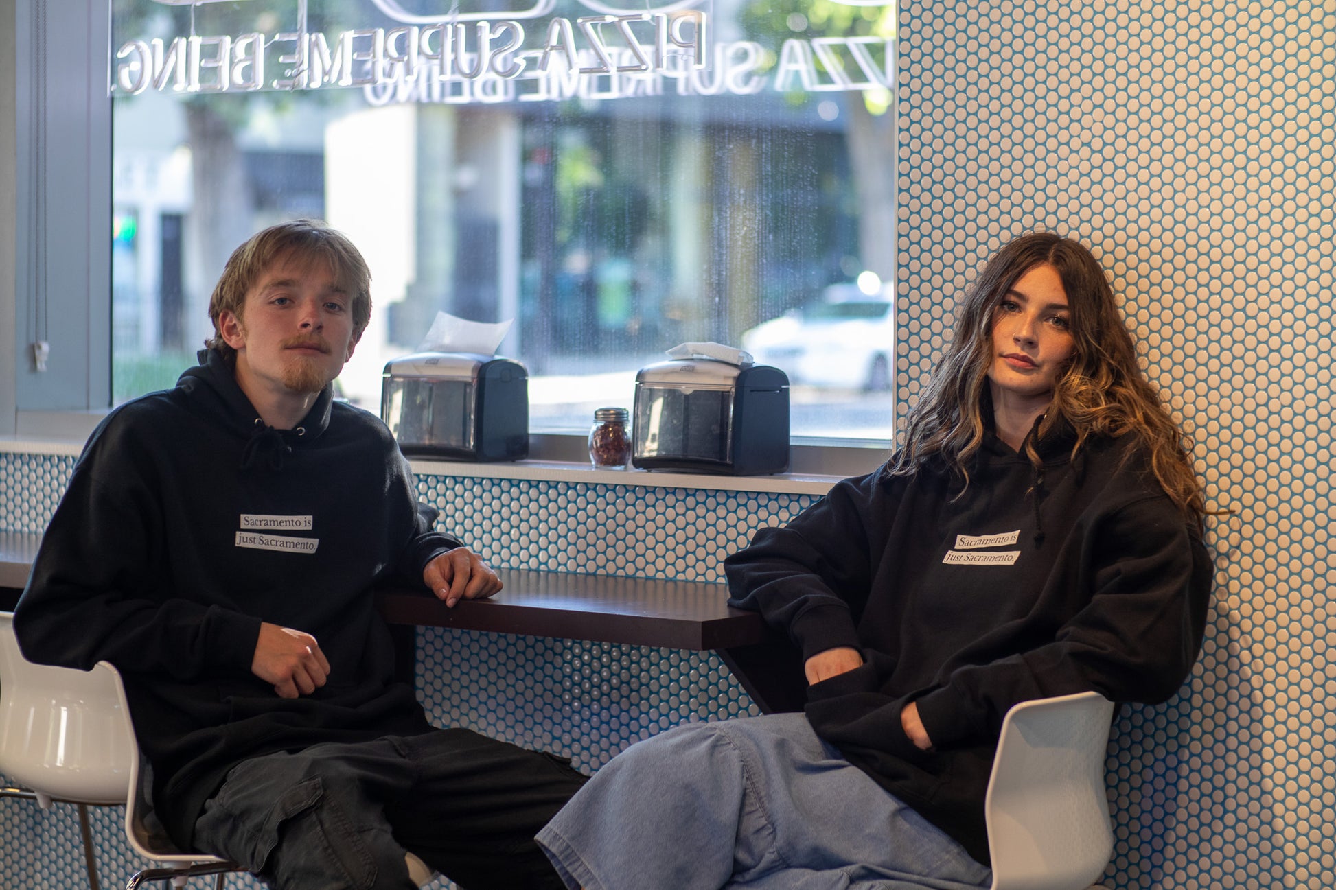 This is a hoodie that features a New York Times quote from Ben Roberts, 36 of Pizza Supreme Being. It is screen printed by hand in beautiful Sacramento California on a heavy weight hoodie (feels more like a medium weight) from Independent Trading Co. These hoodies fit pretty true to size, but if you want it baggy, size up! Both models are wearing a large.